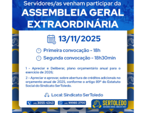 SerToledo convoca servidores para Assembleia Geral Extraordinária