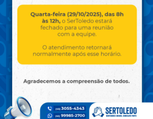Aviso referente ao horário de funcionamento do SerToldo no Dia 29/10/2025